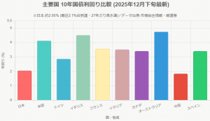 最新の10年国債利回り比較データをAIに出してもらったら明白。こんな低い金利で金利が上昇してるから財政出動を控えろなんて言ってる政治家は下野一択かなと考えます。ここまで日本が衰退した原因の一つがこれまでの経済政策の誤りであり、旧与野党の連中は反省がないので、選挙の度にそのような政治家は落選させていくしかありませんね。